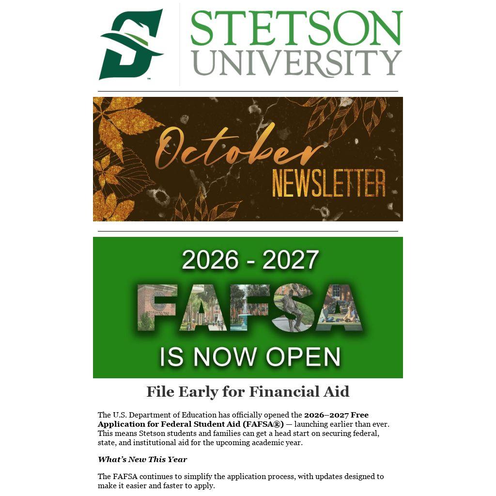 The U.S. Department of Education has officially opened the 2026–2027 Free Application for Federal Student Aid (FAFSA®) — launching earlier than ever. This means Stetson students and families can get a head start on securing federal, state, and institutional aid for the upcoming academic year.