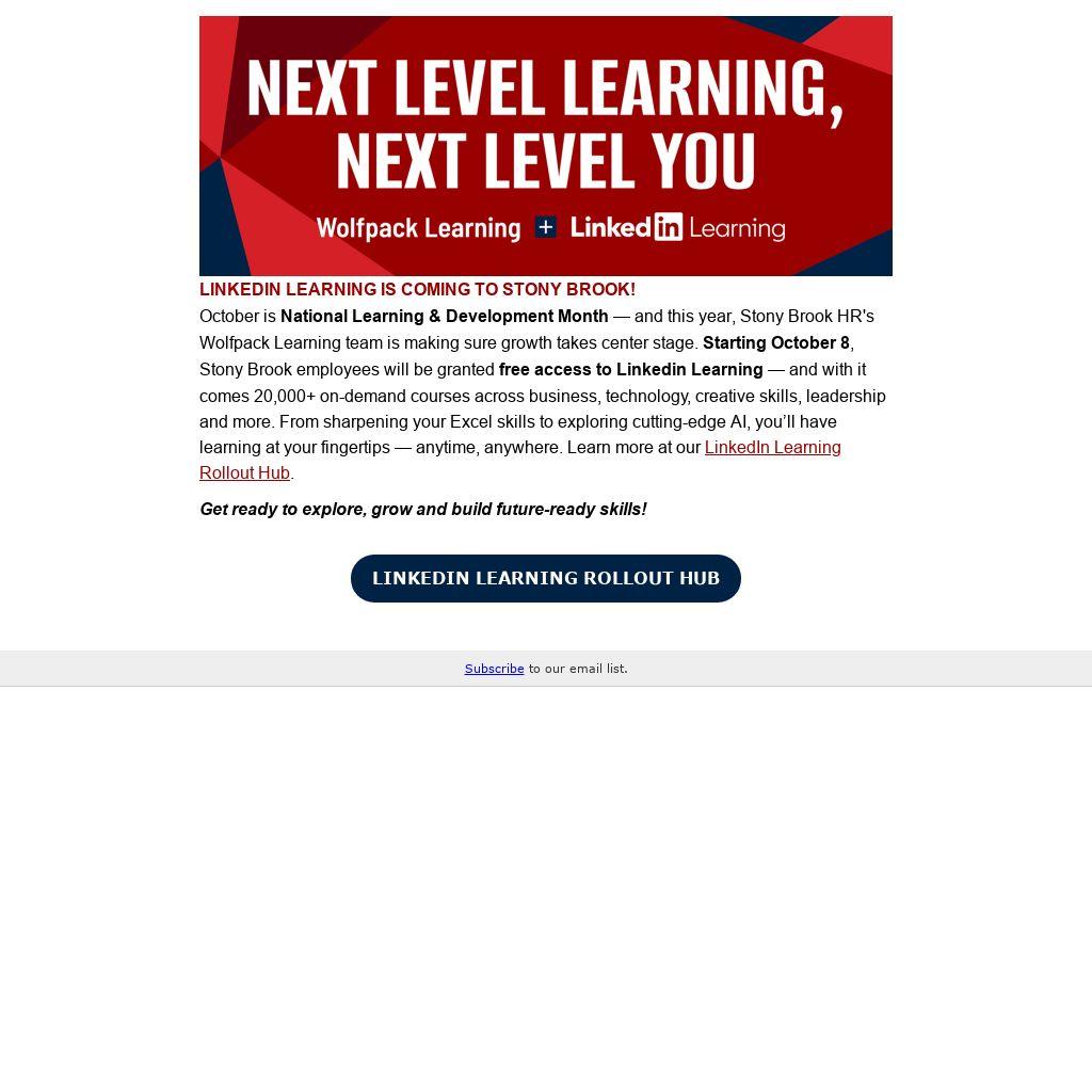 October is National Learning & Development Month — and this year, Stony Brook HR's Wolfpack Learning team is making sure growth takes center stage. Starting October 8, Stony Brook employees will be granted free access to Linkedin Learning — and with it comes 20,000+ on-demand courses across business, technology, creative skills, leadership and more. From sharpening your Excel skills to exploring cutting-edge AI, you’ll have learning at your fingertips — anytime, anywhere. Learn more at our LinkedIn Learning Rollout Hub.