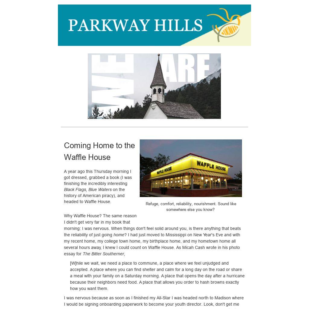 I don't just bring up Waffle House as a remembrance of that morning; rather, I hope the quote I included tugged at your heart because I hope that sort of welcome is your desire for the church. And I hope you know you've been that for me. From the bottom of my heart, thank you.