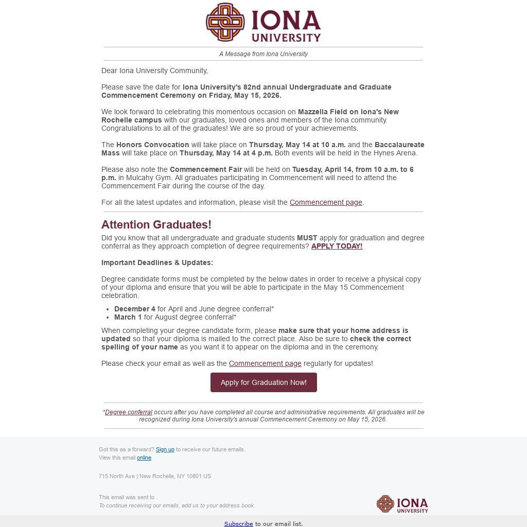 Please save the date for Iona University's 82nd annual Undergraduate and Graduate Commencement Ceremony on Friday, May 15, 2026.