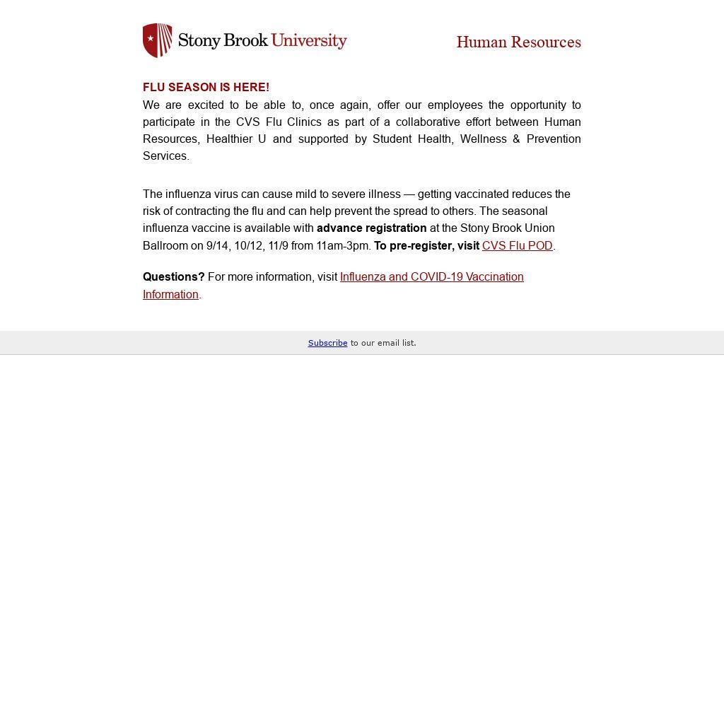 We are excited to be able to, once again, offer our employees the opportunity to participate in the CVS Flu Clinics as part of a collaborative effort between Human Resources, Healthier U and supported by Student Health, Wellness & Prevention Services.