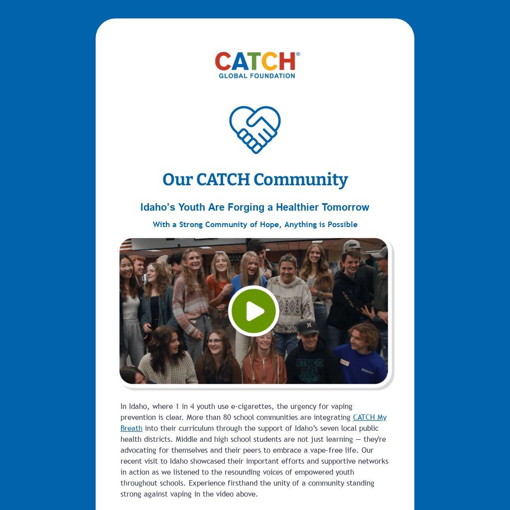 In Idaho, where 1 in 4 youth use e-cigarettes, the urgency for vaping prevention is clear. More than 80 school communities are integrating CATCH My Breath into their curriculum through the support of Idaho’s seven local public health districts. Middle and high school students are not just learning — they're advocating for themselves and their peers to embrace a vape-free life. Our recent visit to Idaho showcased their important efforts and supportive networks in action as we listened to the resounding voices of empowered youth throughout schools. Experience firsthand the unity of a community standing strong against vaping in the video above.