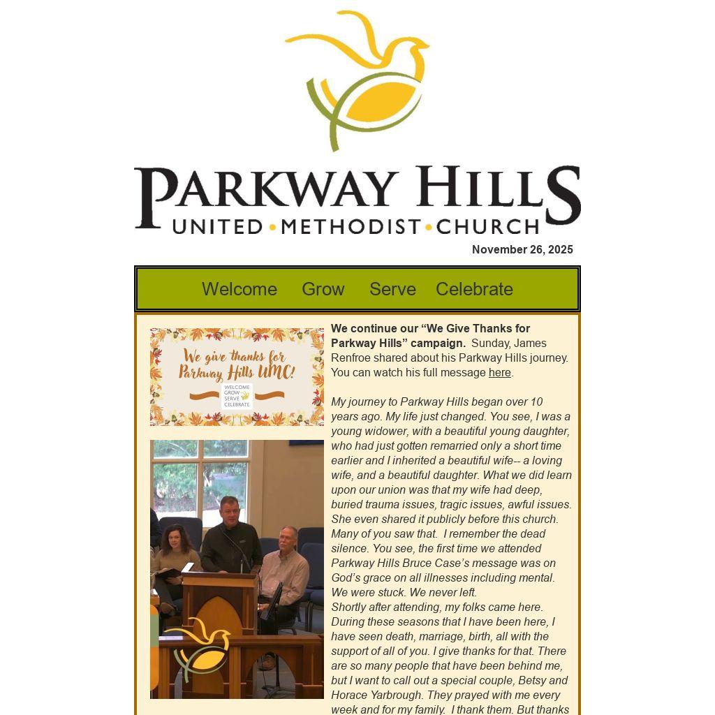 We continue our “We Give Thanks for Parkway Hills” campaign. Sunday, James Renfroe shared about his Parkway Hills journey. You can watch his full message here.