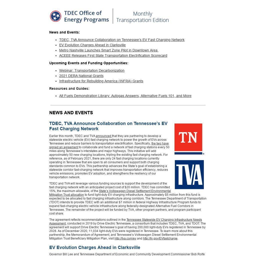Earlier this month, TDEC and TVA announced that they are partnering to develop a statewide electric vehicle (EV) fast charging network to power the growth of EVs across Tennessee and reduce barriers to transportation electrification. Specifically, the two have signed an agreement to collaborate and fund a network of fast charging stations every 50 miles along Tennessee’s interstates and major highways. This initiative will add approximately 50 new charging locations, tripling the existing fast charging network. For reference, as of February 2021, there are only 24 fast charging locations currently operating in Tennessee that are open to all consumers and support both charging standards common to EVs. This partnership advances the State’s goal of establishing a statewide corridor fast-charging network that improves transportation efficiency, reduces vehicle emissions, promotes EV adoption, and strengthens the resiliency of our transportation network.