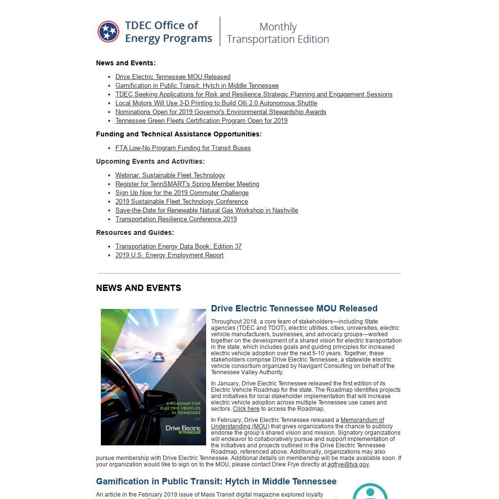 | Drive Electric Tennessee MOU Released Throughout 2018, a core team of stakeholders—including State agencies (TDEC and TDOT), electric utilities, cities, universities, electric vehicle manufacturers, businesses, and advocacy groups—worked together on the development of a shared vision for electric transportation in the state, which includes goals and guiding principles for increased electric vehicle adoption over the next 5-10 years. Together, these stakeholders comprise Drive Electric Tennessee, a statewide electric vehicle consortium organized by Navigant Consulting on behalf of the Tennessee Valley Authority. In January, Drive Electric Tennessee released the first edition of its Electric Vehicle Roadmap for the state. The Roadmap identifies projects and initiatives for local stakeholder implementation that will increase electric vehicle adoption across multiple Tennessee use cases and sectors. Click here to access the Roadmap. In February, Drive Electric Tennessee released a Memorandum of Understanding (MOU) that gives organizations the chance to publicly endorse the group’s shared vision and mission. Signatory organizations will endeavor to collaboratively pursue and support implementation of the initiatives and projects outlined in the Drive Electric Tennessee Roadmap, referenced above. Additionally, organizations may also pursue membership with Drive Electric Tennessee. Additional details on membership will be made available soon. If your organization would like to sign on to the MOU, please contact Drew Frye directly at agfrye@tva.gov.