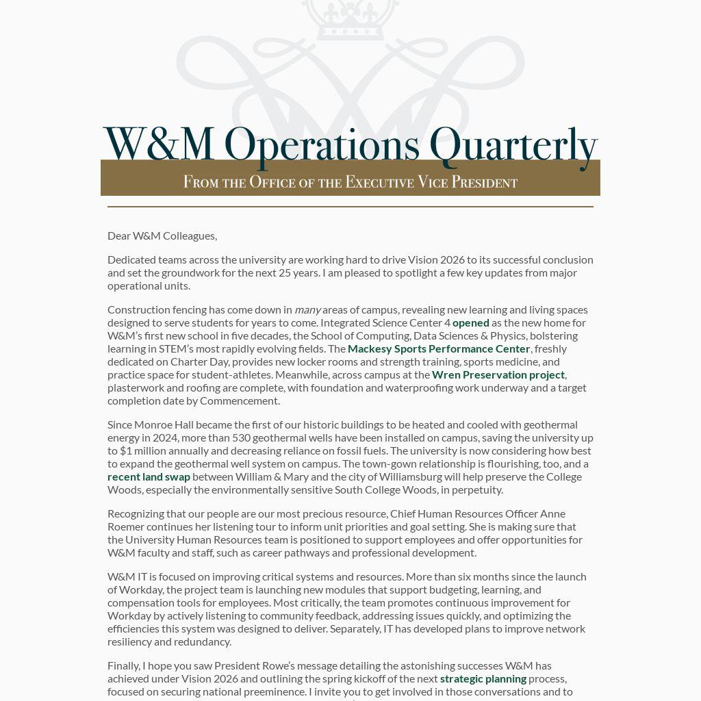 Finally, I hope you saw President Rowe’s message detailing the astonishing successes W&M has achieved under Vision 2026 and outlining the spring kickoff of the next strategic planning process, focused on securing national preeminence. I invite you to get involved in those conversations and to share your unique perspective to help plan for W&M’s future. This is all the more important during the Year of Civic Leadership, during which we recognize that wisdom is best deployed in service to the common good.