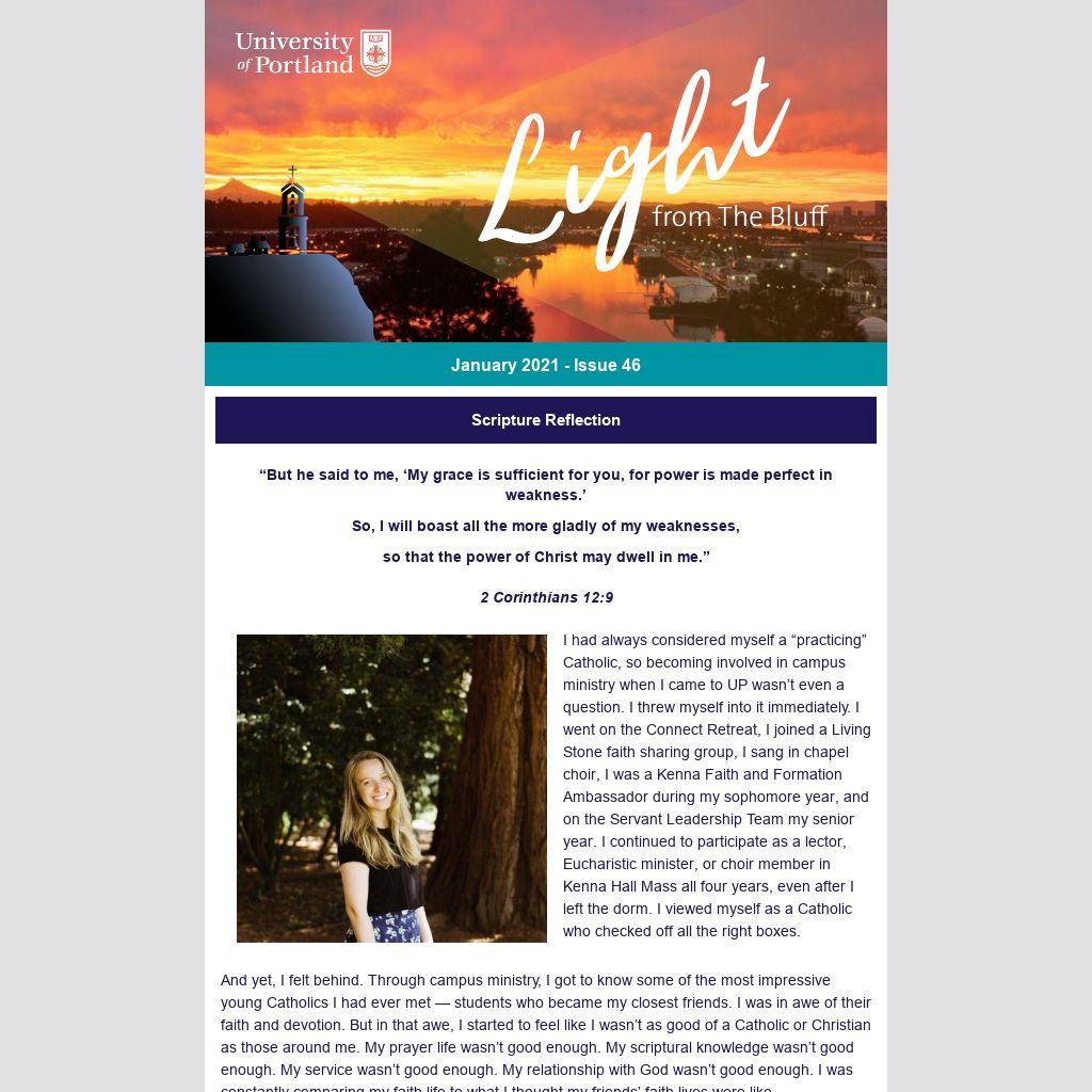 However, as I got to know my peers in campus ministry on a deeper level throughout my four years on The Bluff, I realized that we shared in our struggles with faith and had many of the same questions. My mental image of what a “good” Catholic was started to crack. But it wasn’t until my senior year that the image shattered and I discarded it. I had met up with the other SLT members in the Pilot House one night after classes. We were talking about being Catholic in college, and the conversation turned to how oftentimes, people make incorrect assumptions about us because of our faith. One of the other SLT members expressed her frustration with this, and ultimately exclaimed, “There are infinite ways to be Catholic!”