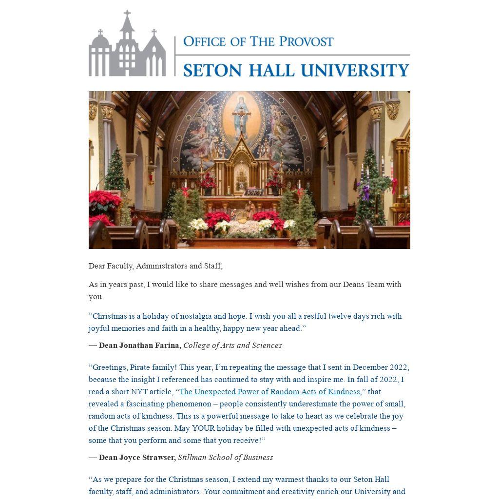“To my Pirate family - This time of year invites us to pause, reflect and appreciate the many ways we support one another—through teaching, learning, research, service and daily acts of kindness. I am so grateful to be a part of the Seton Hall community. May this holiday season bring you rest, joy, and connection with friends and family. Wishing you all peace, good health, and a blessed holiday season.”
