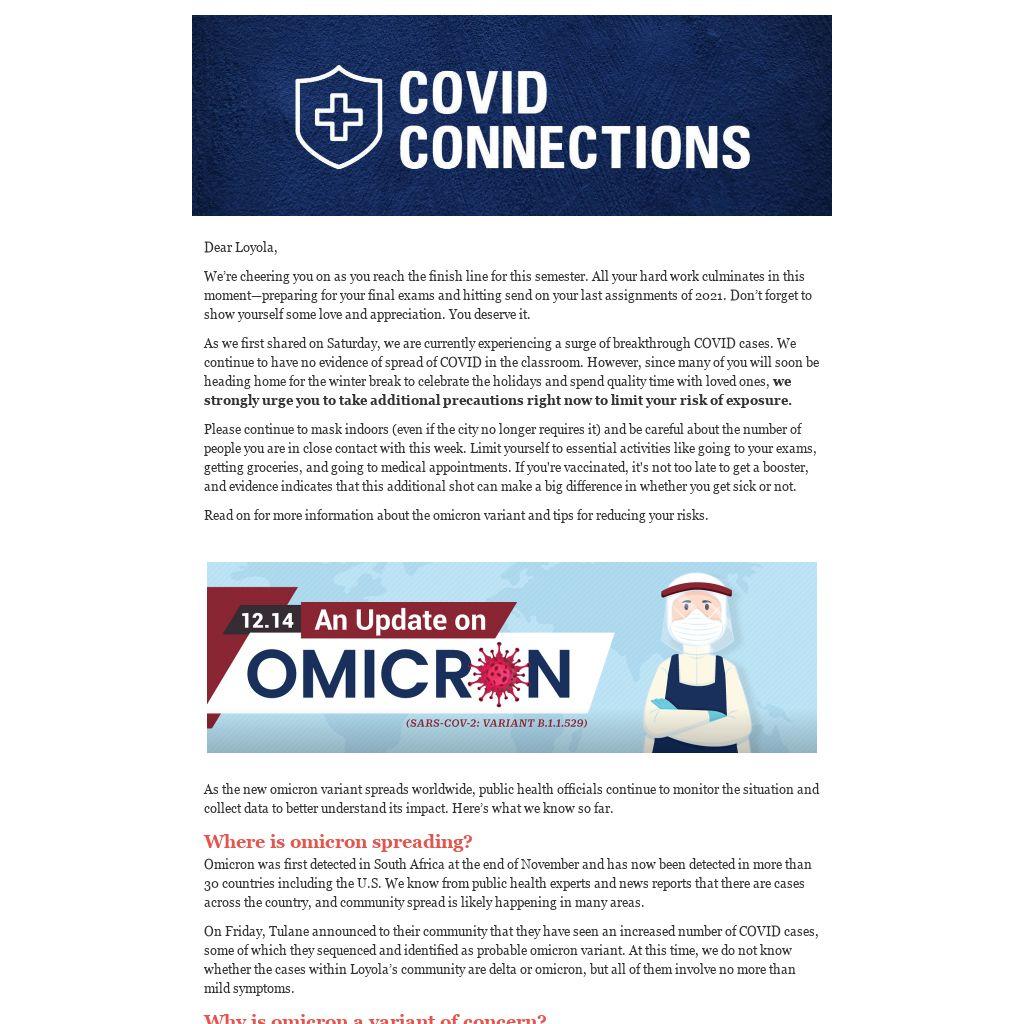 On Friday, Tulane announced to their community that they have seen an increased number of COVID cases, some of which they sequenced and identified as probable omicron variant. At this time, we do not know whether the cases within Loyola’s community are delta or omicron, but all of them involve no more than mild symptoms.