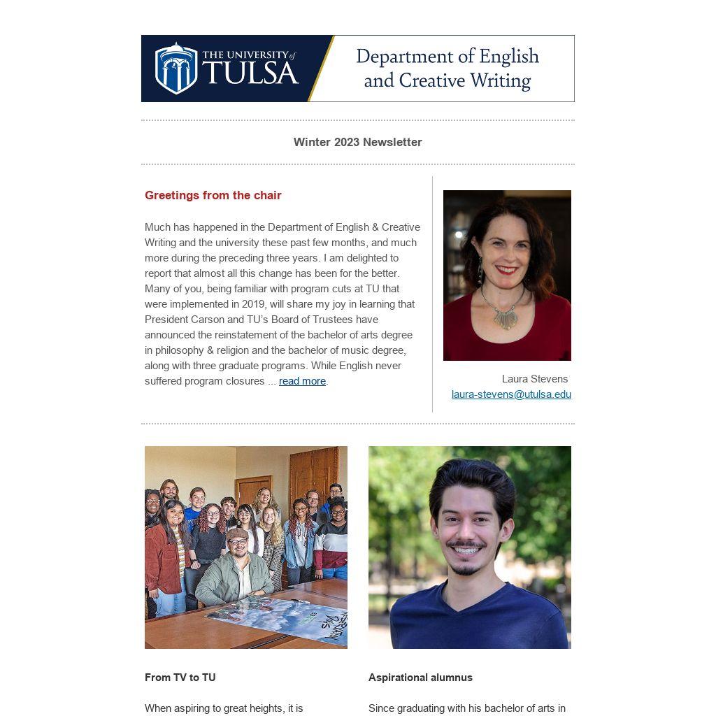 Much has happened in the Department of English & Creative Writing and the university these past few months, and much more during the preceding three years. I am delighted to report that almost all this change has been for the better. Many of you, being familiar with program cuts at TU that were implemented in 2019, will share my joy in learning that President Carson and TU’s Board of Trustees have announced the reinstatement of the bachelor of arts degree in philosophy & religion and the bachelor of music degree, along with three graduate programs. While English never suffered program closures ... read more.