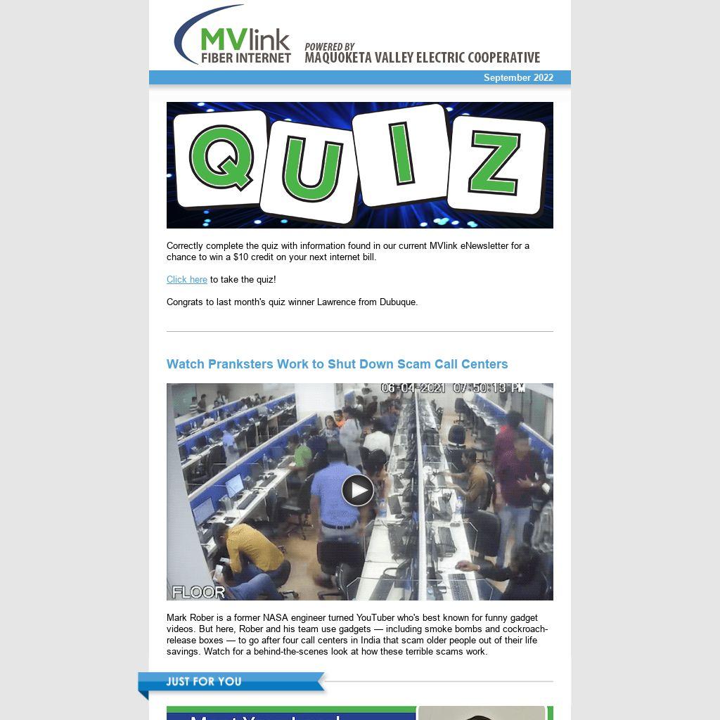 Correctly complete the quiz with information found in our current MVlink eNewsletter for a chance to win a $10 credit on your next internet bill. Click here to take the quiz! Congrats to last month's quiz winner Lawrence from Dubuque. ![]()