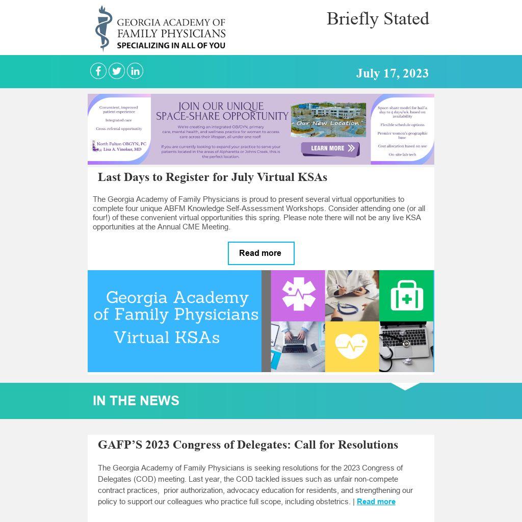 The Georgia Academy of Family Physicians is seeking resolutions for the 2023 Congress of Delegates (COD) meeting. Last year, the COD tackled issues such as unfair non-compete contract practices, prior authorization, advocacy education for residents, and strengthening our policy to support our colleagues who practice full scope, including obstetrics. | Read more