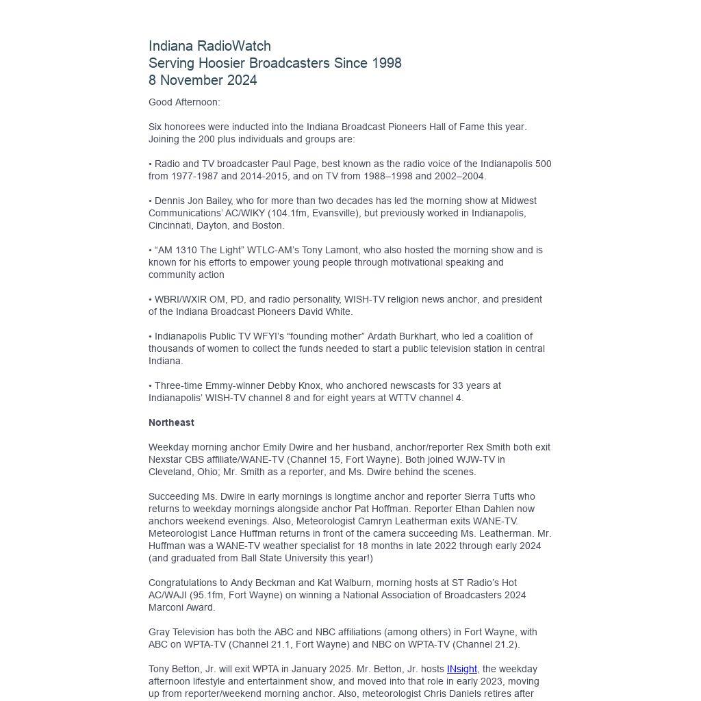 Indiana RadioWatch subscriptions are free. To subscribe, send an e-mail to irw@well.com and we'll add you. After publication, we archive Indiana RadioWatch on the Indiana Radio Archive at indianaradio.net. Please e-mail us your news stories and employment opportunities.