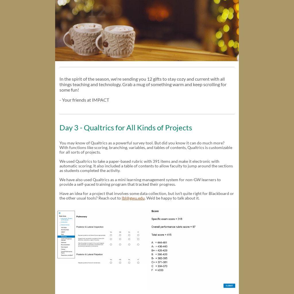 We have also used Qualtrics as a mini learning management system for non-GW learners to provide a self-paced training program that tracked their progress.
