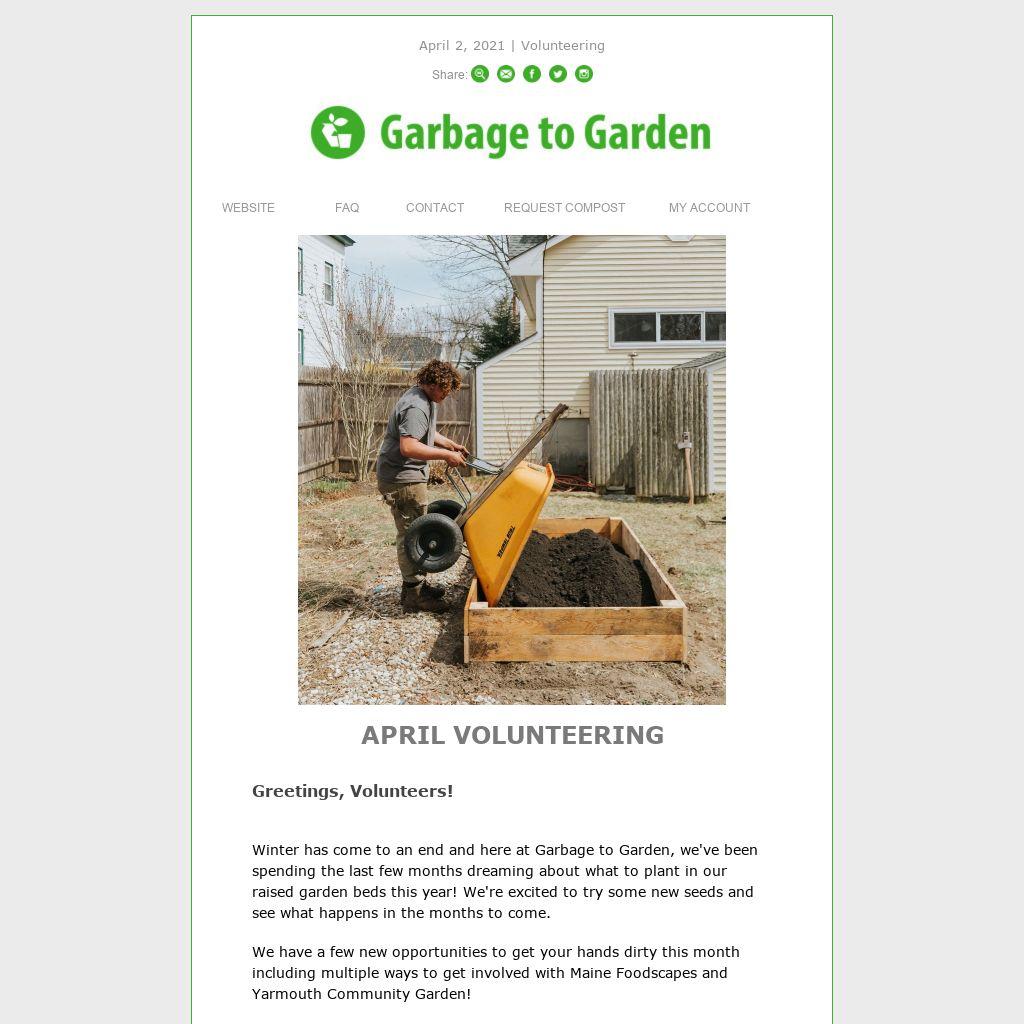 As always, to sign up for an event this month and receive a month of free Garbage to Garden service, RSVP by email, and we will help answer any questions you may have. Remember, events are first-come, first-serve.