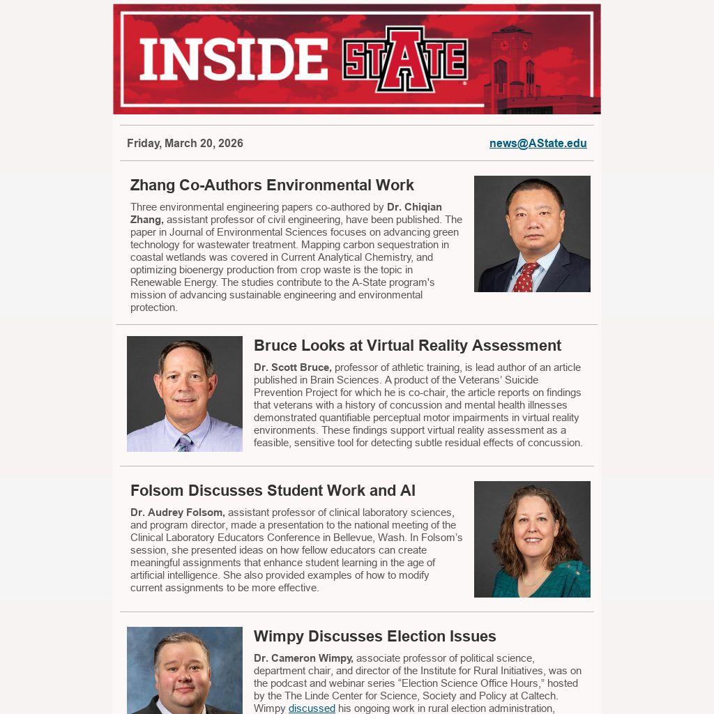 Three environmental engineering papers co-authored by Dr. Chiqian Zhang, assistant professor of civil engineering, have been published. The paper in Journal of Environmental Sciences focuses on advancing green technology for wastewater treatment. Mapping carbon sequestration in coastal wetlands was covered in Current Analytical Chemistry, and optimizing bioenergy production from crop waste is the topic in Renewable Energy. The studies contribute to the A-State program's mission of advancing sustainable engineering and environmental protection.