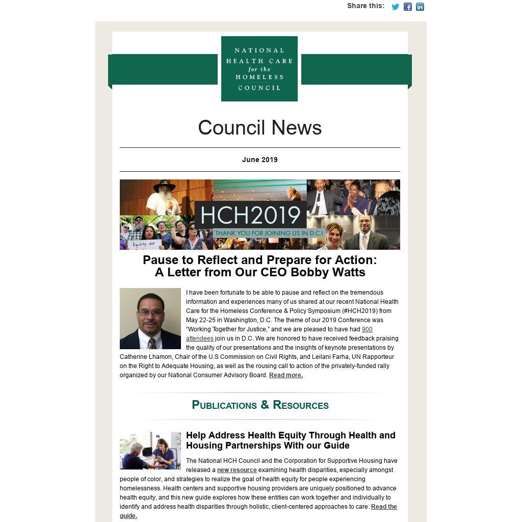 | I have been fortunate to be able to pause and reflect on the tremendous information and experiences many of us shared at our recent National Health Care for the Homeless Conference & Policy Symposium (#HCH2019) from May 22-25 in Washington, D.C. The theme of our 2019 Conference was “Working Together for Justice,” and we are pleased to have had 900 attendees join us in D.C. We are honored to have received feedback praising the quality of our presentations and the insights of keynote presentations by Catherine Lhamon, Chair of the U.S Commission on Civil Rights, and Leilani Farha, UN Rapporteur on the Right to Adequate Housing, as well as the rousing call to action of the privately-funded rally organized by our National Consumer Advisory Board. Read more.