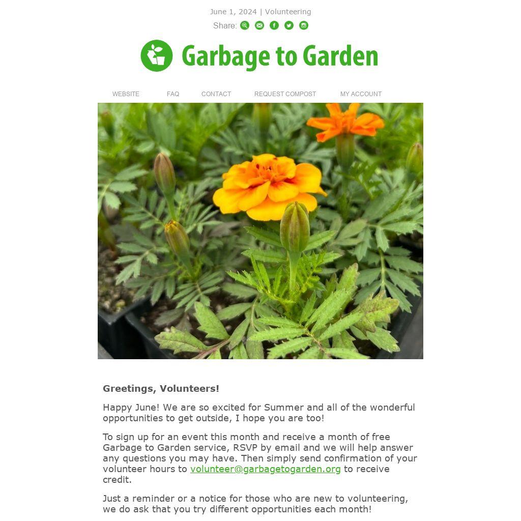 To sign up for an event this month and receive a month of free Garbage to Garden service, RSVP by email and we will help answer any questions you may have. Then simply send confirmation of your volunteer hours to volunteer@garbagetogarden.org to receive credit.
