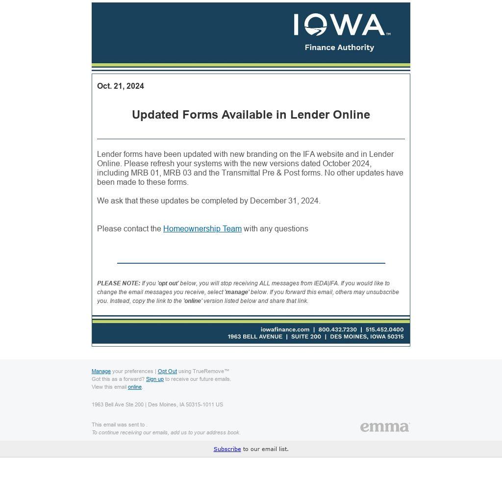 Lender forms have been updated with new branding on the IFA website and in Lender Online. Please refresh your systems with the new versions dated October 2024, including MRB 01, MRB 03 and the Transmittal Pre & Post forms. No other updates have been made to these forms.