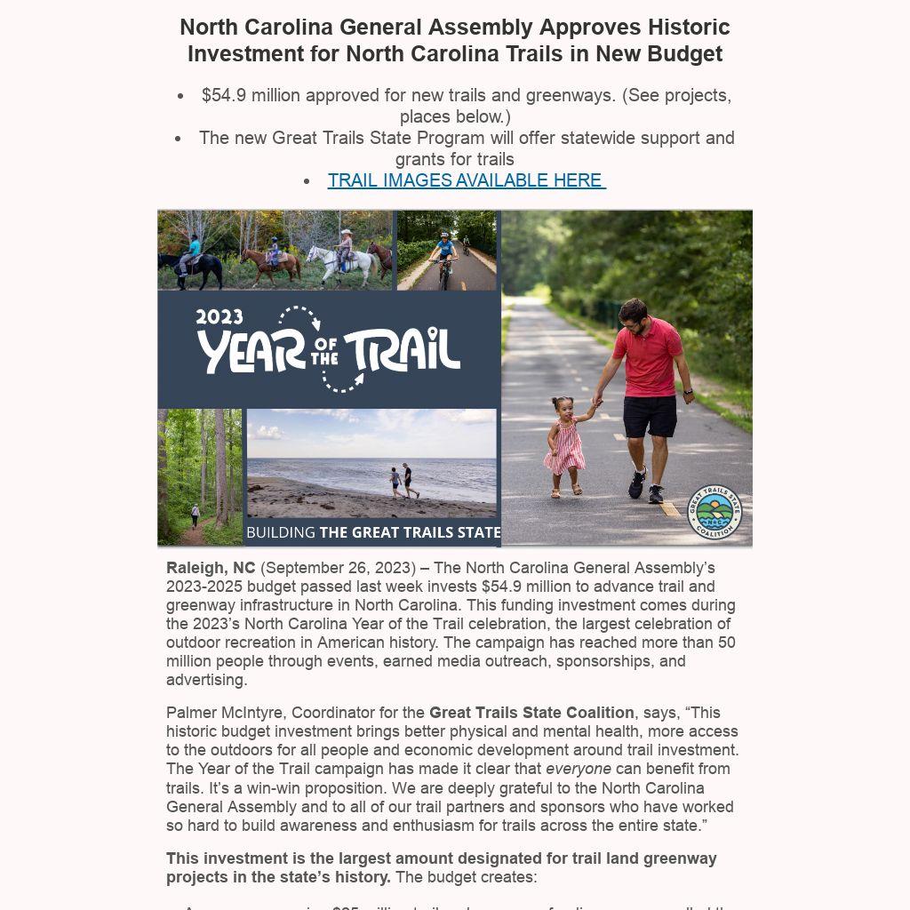 The Great Trails State Program, funded with $12.5 million each year for two years, will be a competitive grant program for new trail development and extension of existing trails, including paved trails, greenways, and natural surface trails for biking, hiking, walking, equestrian use, and paddling. The fund will be administered by the North Carolina Department of Natural and Cultural Resources (NCDNCR).