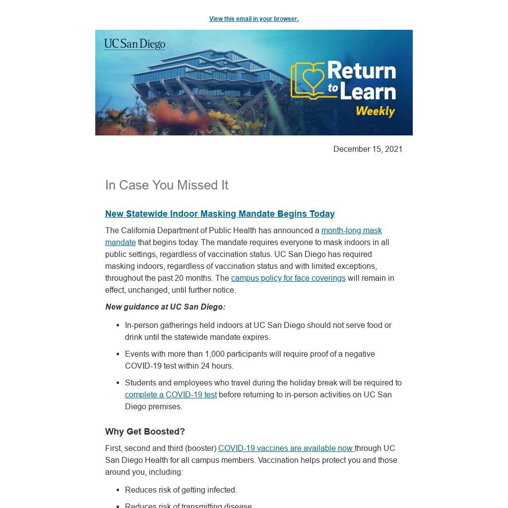 - Students and employees who travel during the holiday break will be required to complete a COVID-19 test before returning to in-person activities on UC San Diego premises.
