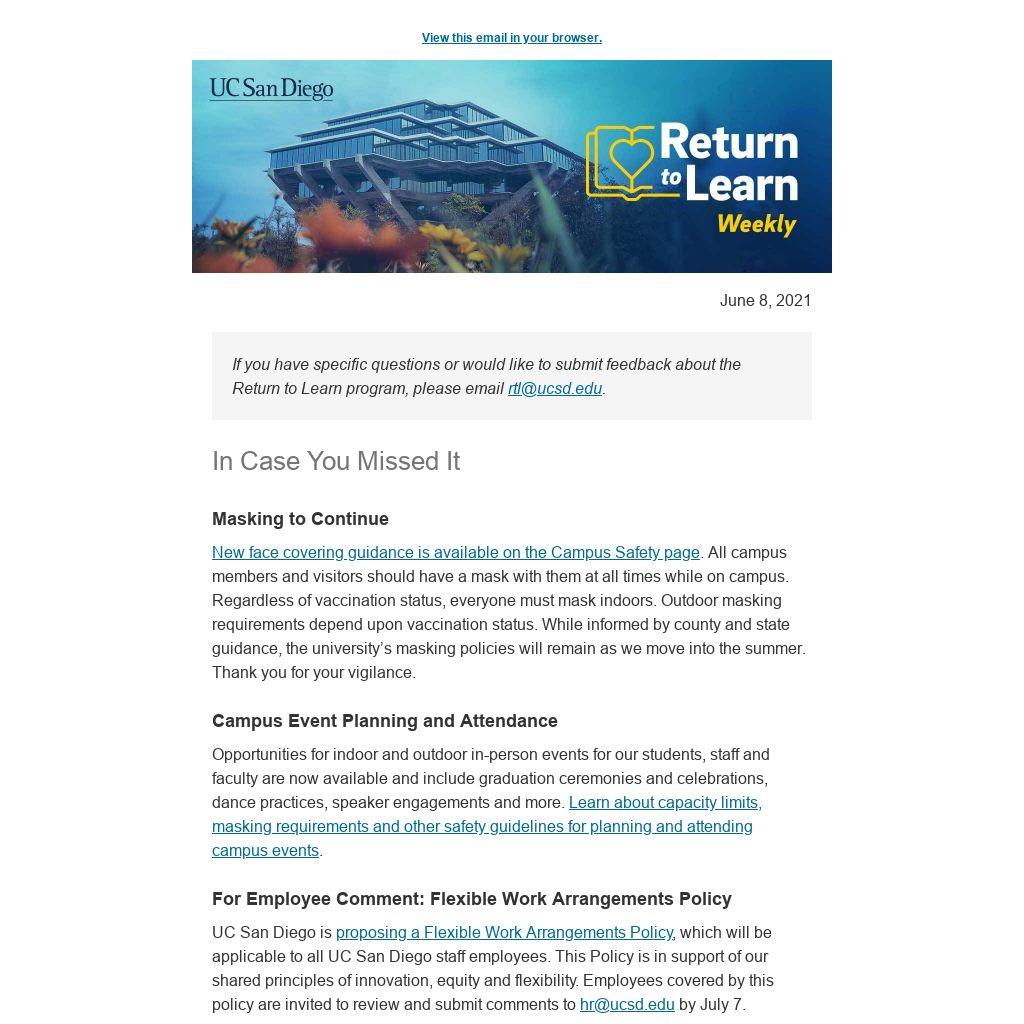 Answer: All health and safety measures will be observed, based on California and county guidelines, as well as campus policies, which require continuous masking for the duration of each Commencement ceremony, except when actively hydrating.