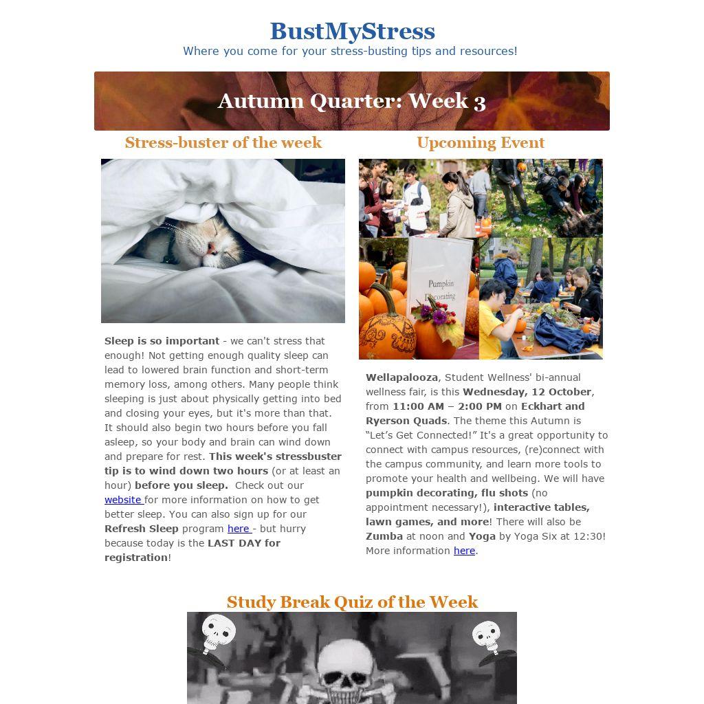 Wellapalooza, Student Wellness' bi-annual wellness fair, is this Wednesday, 12 October, from 11:00 AM – 2:00 PM on Eckhart and Ryerson Quads. The theme this Autumn is “Let’s Get Connected!” It's a great opportunity to connect with campus resources, (re)connect with the campus community, and learn more tools to promote your health and wellbeing. We will have pumpkin decorating, flu shots (no appointment necessary!), interactive tables, lawn games, and more! There will also be Zumba at noon and Yoga by Yoga Six at 12:30! More information here.