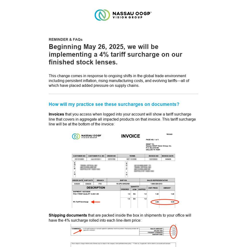 Beginning May 26, 2025, we will be implementing a 4% tariff surcharge on our finished stock lenses. |