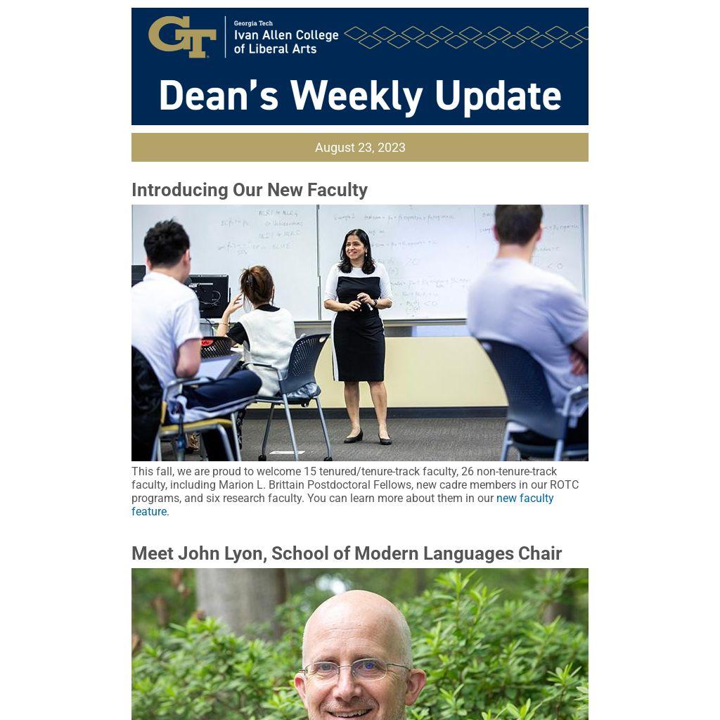 Kaye Husbands Fealing, Dean of Ivan Allen College of Liberal Arts and Ivan Allen Jr. Chair, will share College and Institute priorities for this academic year; convey our progress toward achieving our strategic plan; and acknowledge student, staff, and faculty achievements. Students, faculty, and staff will have an opportunity to ask questions and are invited to a fall welcome reception immediately following the address.