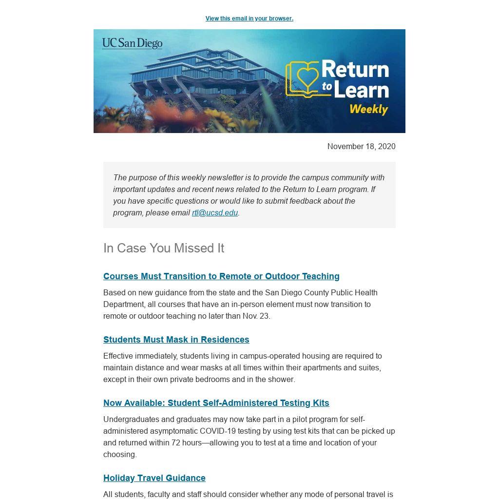 The purpose of this weekly newsletter is to provide the campus community with important updates and recent news related to the Return to Learn program. If you have specific questions or would like to submit feedback about the program, please email rtl@ucsd.edu.