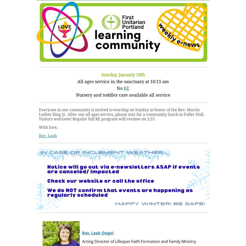 Everyone in our community is invited to worship on Sunday in honor of the Rev. Martin Luther King Jr. After our all ages service, please stay for a community lunch in Fuller Hall. Visitors welcome! Regular full RE program will resume on 1/25.