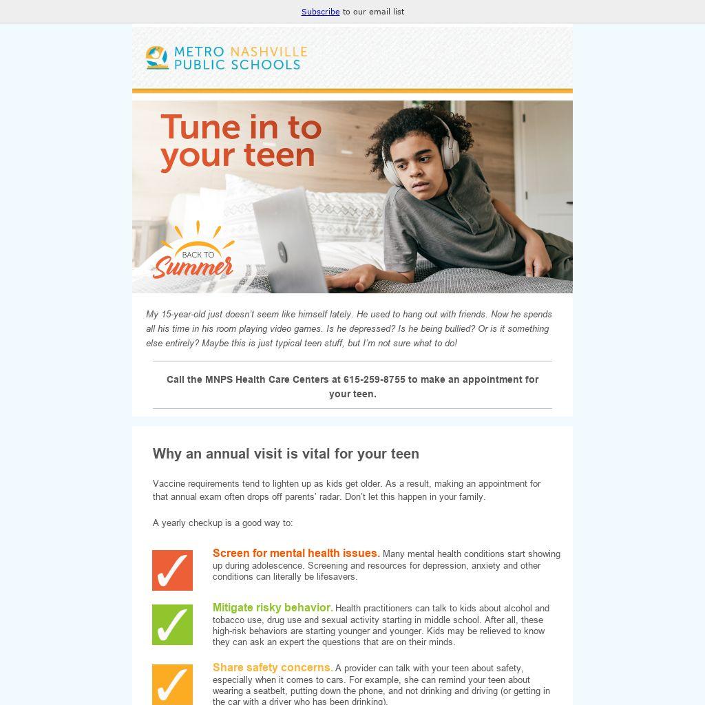 Call the MNPS Health Care Centers at 615-259-8755 to make an appointment for your teen.