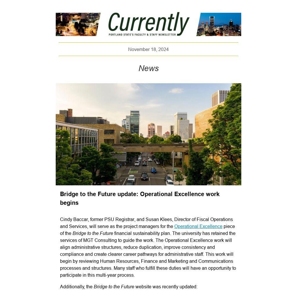 CURRENTLY is a weekly newsletter for the employees of Portland State University, published by University Communications. News items, events and accolades should be sent to currently@pdx.edu. Deadline is noon, the Tuesday before publication. See the Currently website for submission guidelines and schedule.