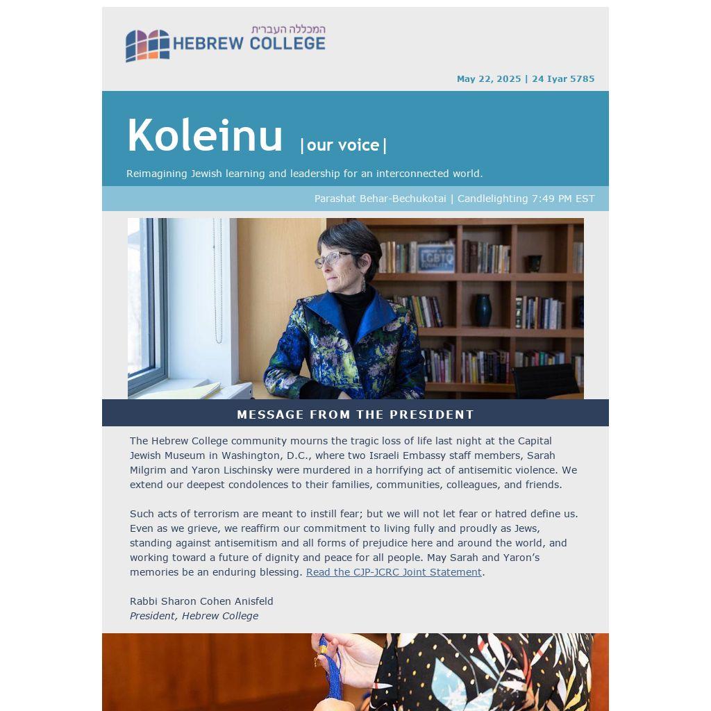 The Hebrew College community mourns the tragic loss of life last night at the Capital Jewish Museum in Washington, D.C., where two Israeli Embassy staff members, Sarah Milgrim and Yaron Lischinsky were murdered in a horrifying act of antisemitic violence. We extend our deepest condolences to their families, communities, colleagues, and friends.