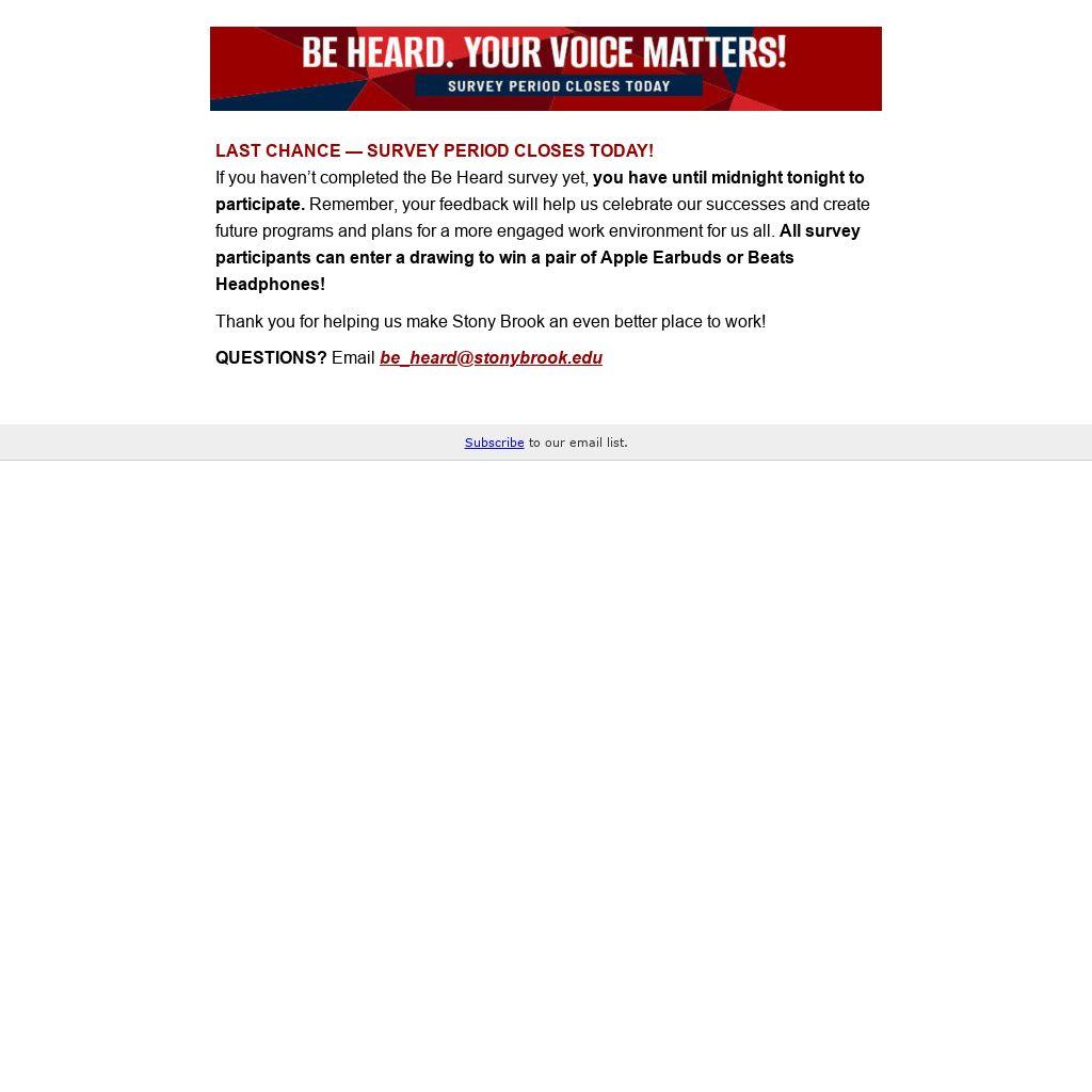 If you haven’t completed the Be Heard survey yet, you have until midnight tonight to participate. Remember, your feedback will help us celebrate our successes and create future programs and plans for a more engaged work environment for us all. All survey participants can enter a drawing to win a pair of Apple Earbuds or Beats Headphones!