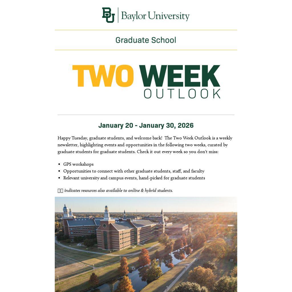 Happy Tuesday, graduate students, and welcome back! Â The Two Week Outlook is a weekly newsletter, highlighting events and opportunities in the following two weeks, curated by graduate students for graduate students. Check it out every week so you don't miss: