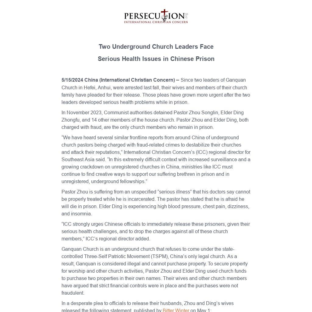 5/15/2024 China (International Christian Concern) – Since two leaders of Ganquan Church in Hefei, Anhui, were arrested last fall, their wives and members of their church family have pleaded for their release. Those pleas have grown more urgent after the two leaders developed serious health problems while in prison.