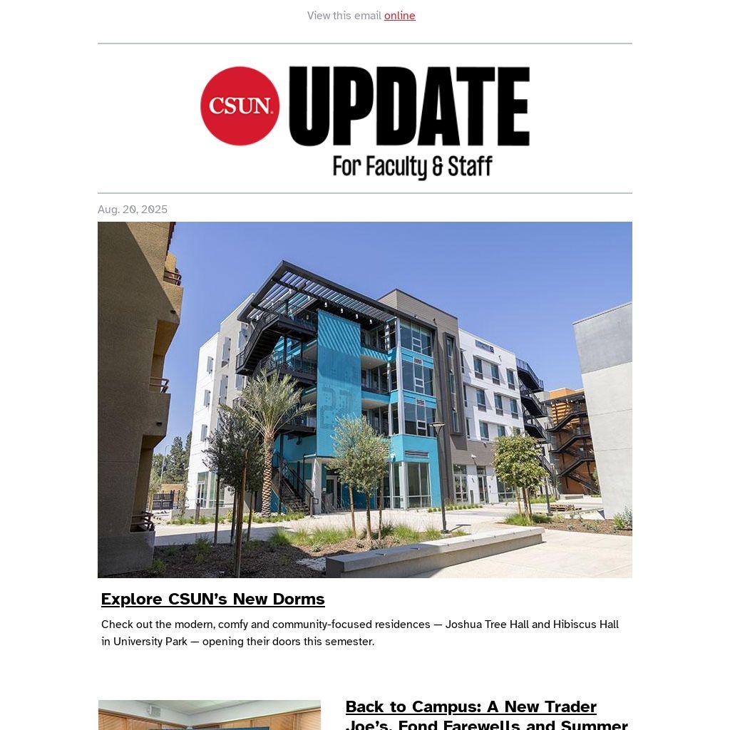 Catch up on the summer happenings, Matadors! A brand-new Trader Joe’s — featuring student artwork — opened just steps from campus. And we said a heartfelt goodbye to Daisy, CSUN’s beloved K-9 officer, as she retired from service. Check out the stories on CSUN Newsroom.