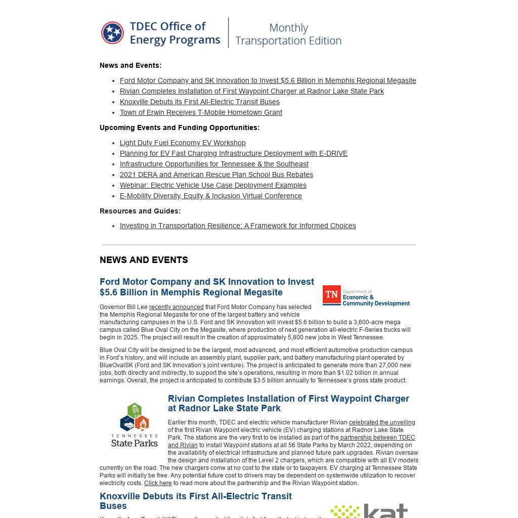 TennSMART will host a virtual member meeting on November 4 from 11:30 AM-2:00 PM Central that breaks down research and funding opportunities for Tennessee in the bipartisan infrastructure bill currently contemplated by the U.S. Congress. The event will also showcase recent economic development opportunities that position Tennessee as a leader in transportation innovation, including a discussion of ways to build a workforce to support new manufacturing. Click here to register.