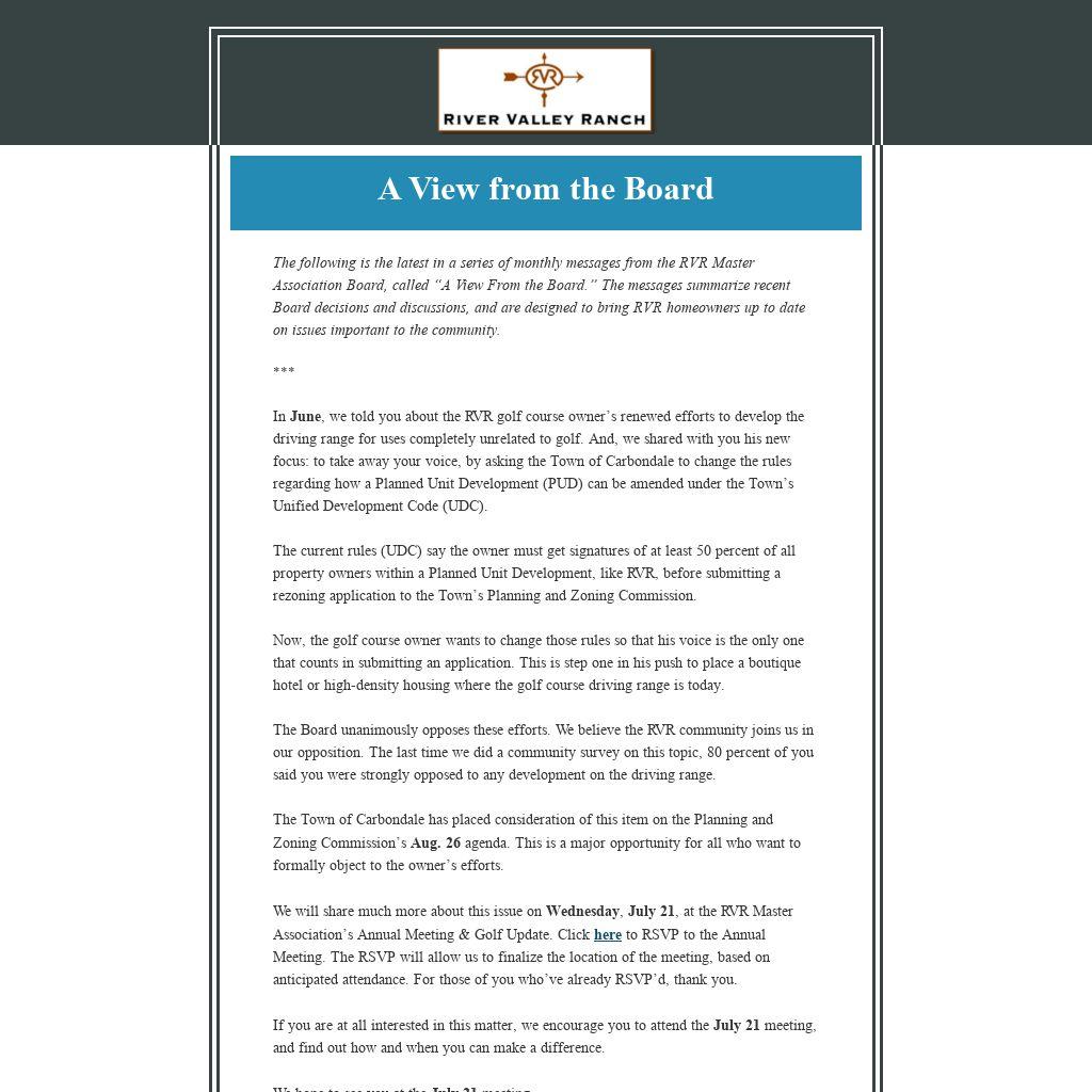 We will share much more about this issue on Wednesday, July 21, at the RVR Master Association’s Annual Meeting & Golf Update. Click here to RSVP to the Annual Meeting. The RSVP will allow us to finalize the location of the meeting, based on anticipated attendance. For those of you who’ve already RSVP’d, thank you.