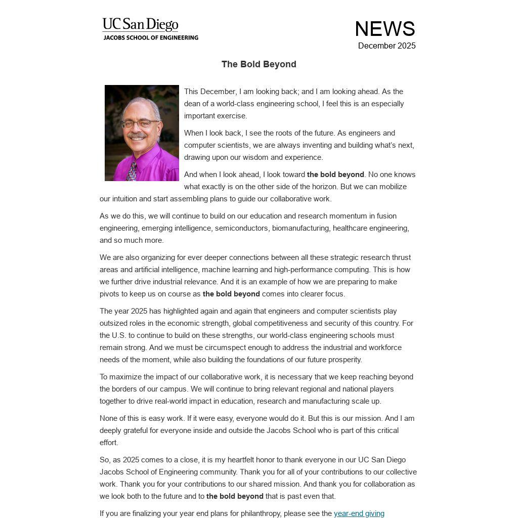 So, as 2025 comes to a close, it is my heartfelt honor to thank everyone in our UC San Diego Jacobs School of Engineering community. Thank you for all of your contributions to our collective work. Thank you for your contributions to our shared mission. And thank you for collaboration as we look both to the future and to the bold beyond that is past even that.
