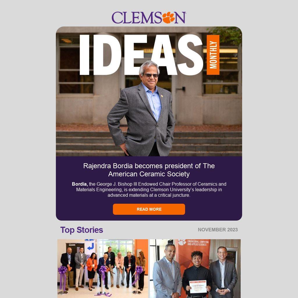IDEAS Monthly is published by the PROMO Office in Clemson University’s College of Engineering, Computing and Applied Sciences. Contact the team with feedback or story suggestions.