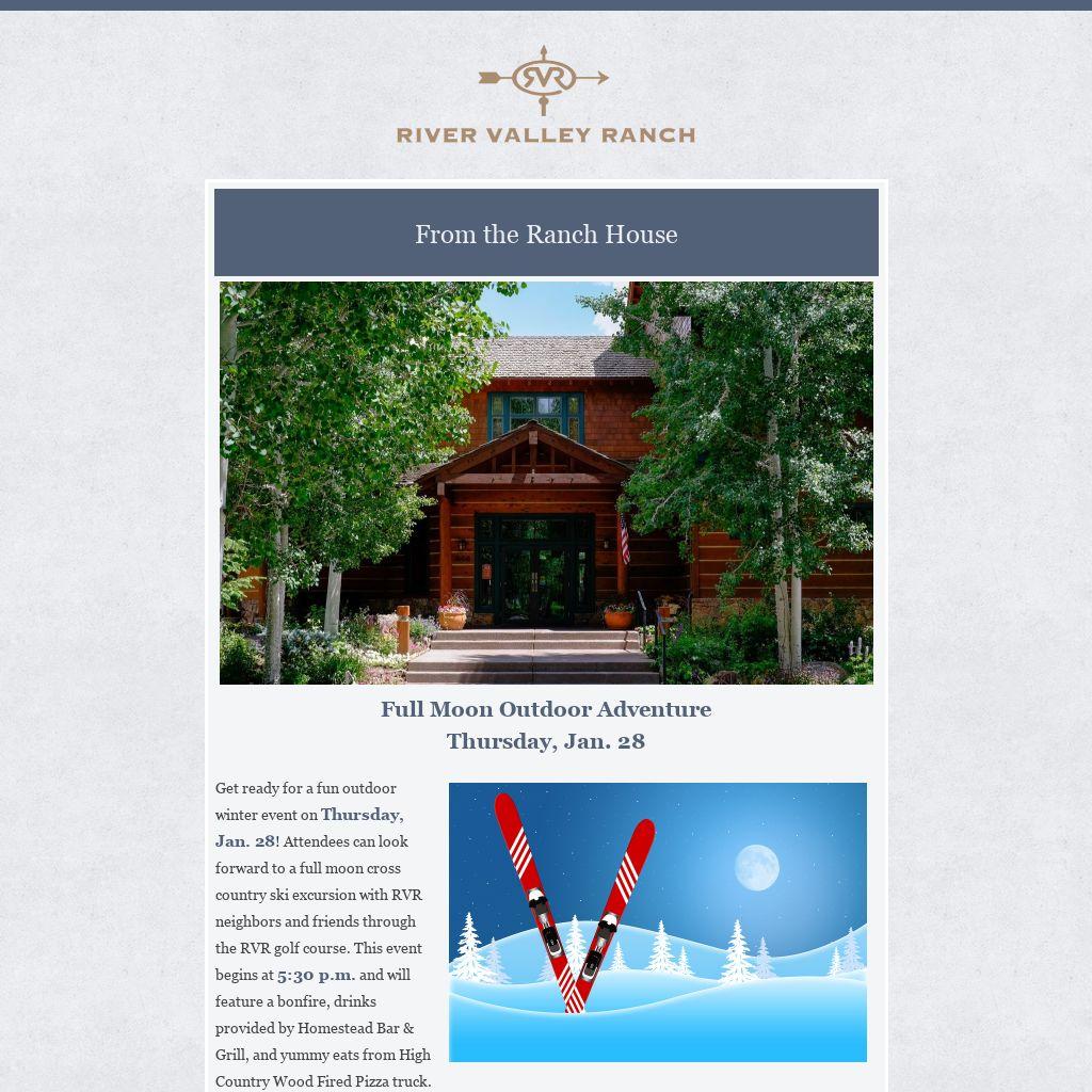 Get ready for a fun outdoor winter event on Thursday, Jan. 28! Attendees can look forward to a full moon cross country ski excursion with RVR neighbors and friends through the RVR golf course. This event begins at 5:30 p.m. and will feature a bonfire, drinks provided by Homestead Bar & Grill, and yummy eats from High Country Wood Fired Pizza truck.