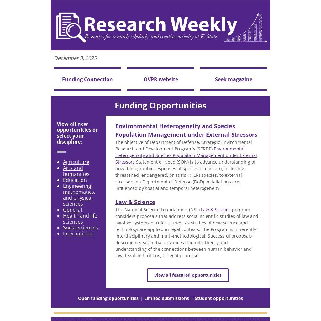 Join President Linton, VPR Coetzee and Vice President for Administration and Finance Erickson for a Research Funding and Budgeting Town Hall discussing K-State’s federal funding outlook, upcoming F&A policy changes, investments in research capacity and new strategies for securing additional grant funding.