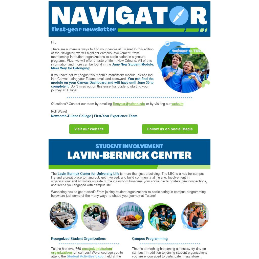 There are numerous ways to find your people at Tulane! In this edition of the Navigator, we will highlight campus involvement, from membership in student organizations to participation in signature programs. Plus, we will offer a taste of life in New Orleans. All of this information and more can be found in the June New Student Module: Make Way for Belonging!