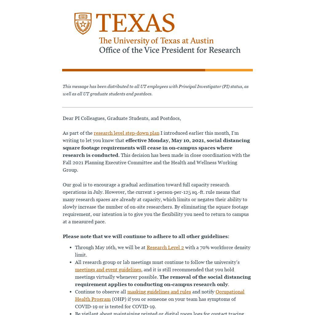 This message has been distributed to all UT employees with Principal Investigator (PI) status, as well as all UT graduate students and postdocs.