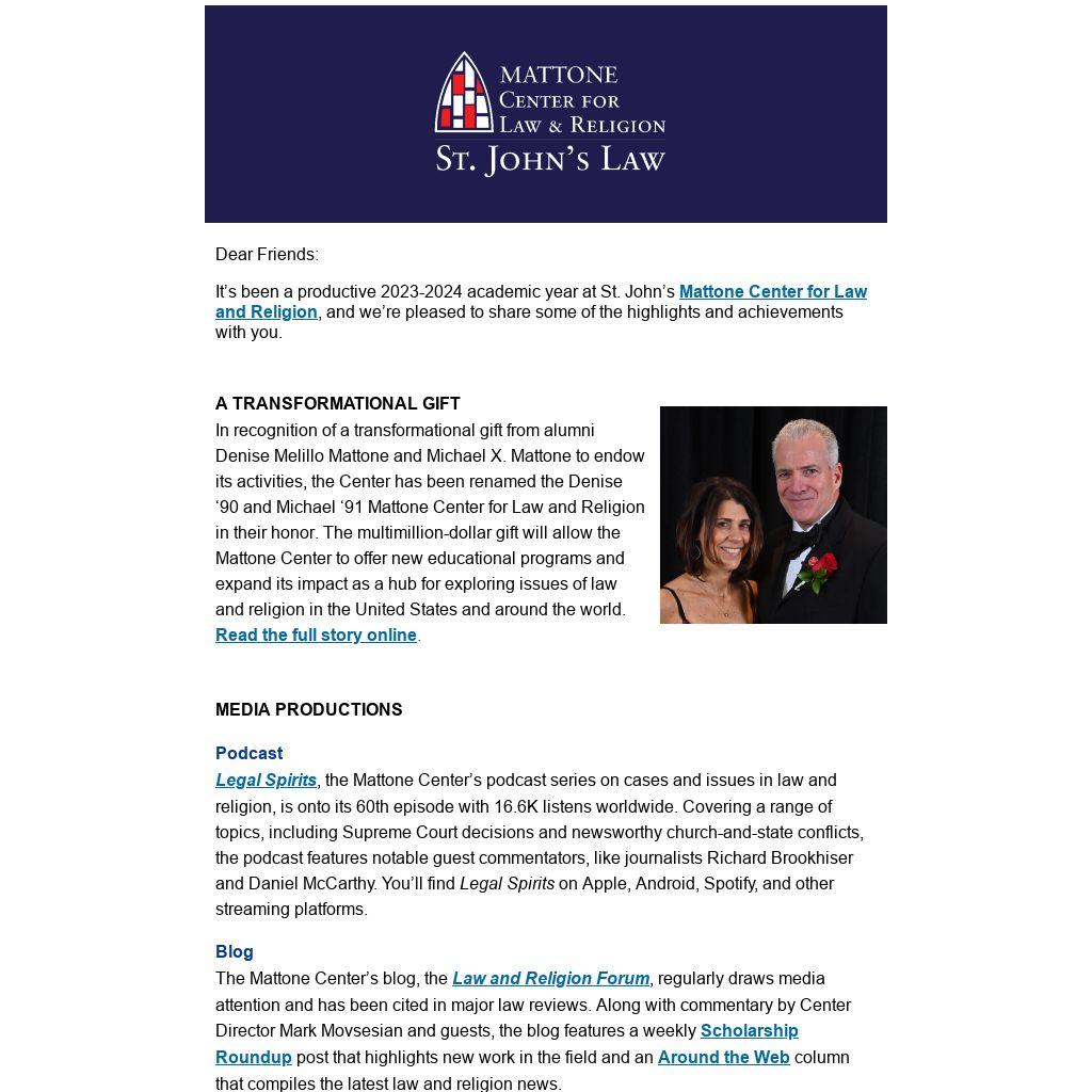 It’s been a productive 2023-2024 academic year at St. John’s Mattone Center for Law and Religion, and we’re pleased to share some of the highlights and achievements with you.