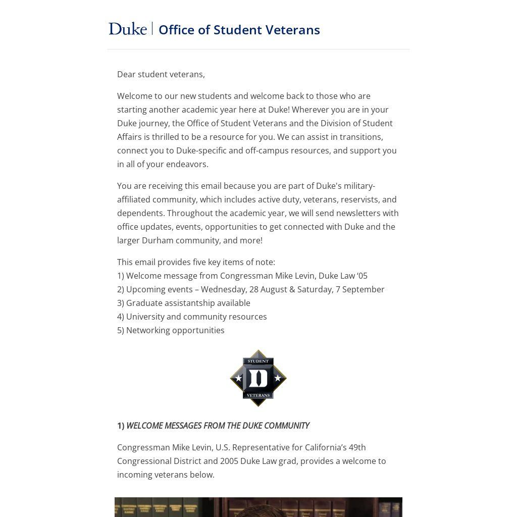 You are receiving this email because you are part of Duke's military-affiliated community, which includes active duty, veterans, reservists, and dependents. Throughout the academic year, we will send newsletters with office updates, events, opportunities to get connected with Duke and the larger Durham community, and more!