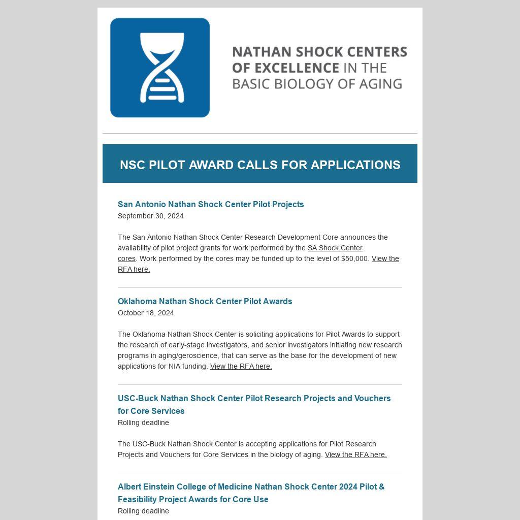 The University of Washington Nathan Shock Center and Healthy Aging and Longevity Research Institute are soliciting applications to support pilot projects in the biology of aging.* View the RFA here.