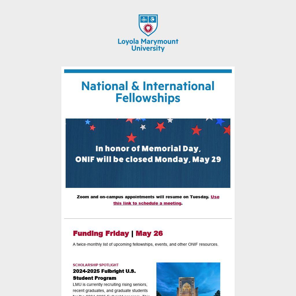 Fulbright Application Overview Webinar for LMU Applicants on June 5 at 12:00 p.m. PT LMU students and alumni committed to applying for the 2024-2025 Fulbright U.S. Student Program (ETA and Study/Research) are invited to attend this webinar about LMU's campus process. Register here.